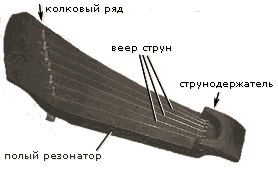 струнодержатель, колковый ряд и резонатор, расположенный под струнами на всю длину струны. В