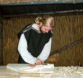 Демонстрация изготовления гуслей на фестивале "Бискупин" (Польша) Фотограф: Viki Kurchenk (Калининград). 2005 год.
