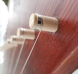 Колки: клён. Клён интересен как материал для колков тем, что волокна в нём невыраженные, он твёрдый, но в то же время поверхность клёна достаточно мягкая для того, чтобы колки великолепно подстроились под коническое колковое отверстие, плавно крутились и идеально держали строй.