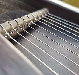 Струны: голые стальные, натяжение слабое. Металлические струны возможно стояли ещё на гуслях XI века, и наиболее подходят