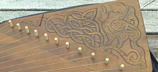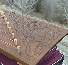 The wing of the gusli is decorated with carvings based on a medieval picture from Eastern Europe and a pattern typical for medieval gusli.