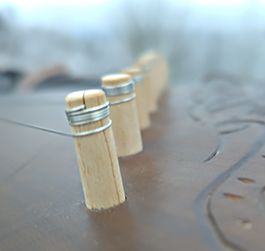 Pegs: maple. Maple — is interesting as a material for the pegs, as its wood-fibres are not accentuated. The maple wood is a hard one, but at the same time its surface is soft enough for the pegs to be perfectly adjusted to the cone-shaped peg hole, to spin smoothly and to hold the pitch perfectly.
